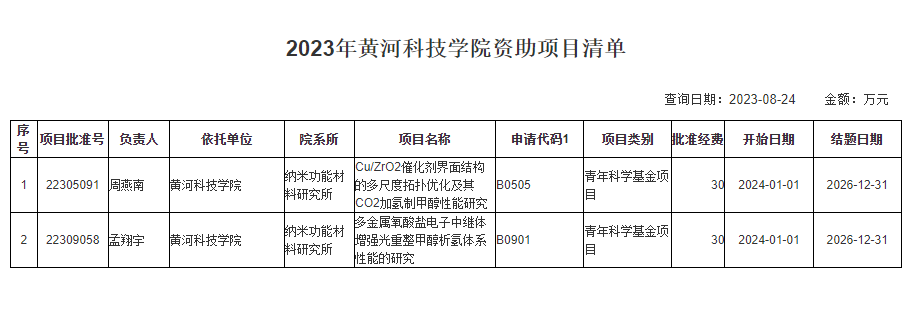 近日, 国家自然科学基金委公布了2023年度自然科学基金集中接受申请项目评审结果,太阳官网纳米功能材料研究所周燕南博士、孟翔宇博士分别获批国家青年科学基金项目立项。此外,医学院贾安博士参与(第2名)国家青年科学基金项目获批立项。太阳官网为全省唯一获批立项国家自然科学基金项目的民办高校。
