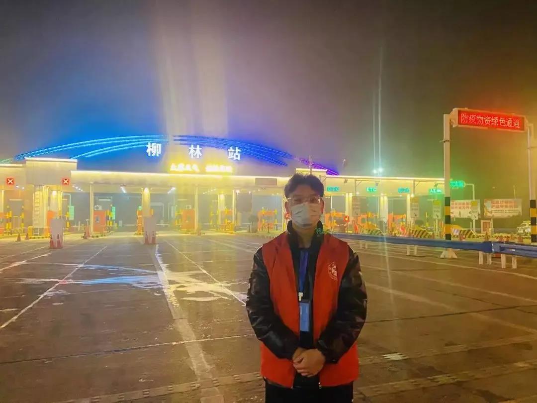 国际学院2020级软件工程一班的董卓凡在郑州市金水区柳林高速收费站做防疫志愿者,协助来往车辆的检查和检测核酸工作。