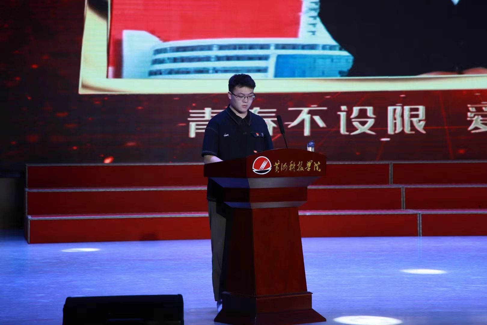 舞台上,他的声音铿锵有力,他的目光坚定有神。