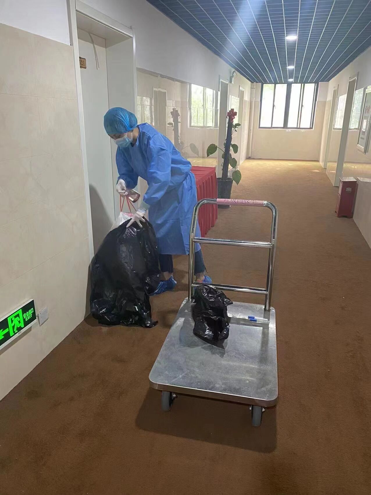 早上07:30、中午11:30、晚上6:00前后,李燕楠换好隔离防护服上楼为每名监测人员配送三餐;每天16:00,李燕楠再次换上隔离防护服并带上酒精喷壶等消杀用品,上楼逐一区域消杀并清理每名监测人员的当日生活垃圾;每天三次的送餐、垃圾清理同时,李燕楠还需查看监测人员有无异常、通过简答的询问了解监测人员的情绪是否出现波动,并将每名监测人员的体温进行如实登记。在此期间,李燕楠还需不定时不定点的接收监测人员同学、同事前来递送的生活物品和学习用品等,并对所有外送物品进行消杀处理,然后在第一时间配送给监测入住人员......