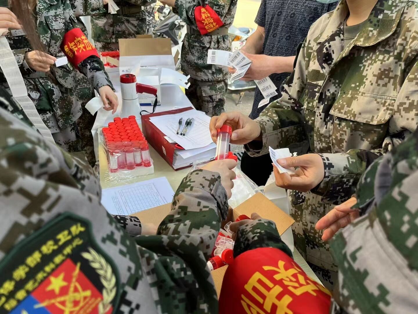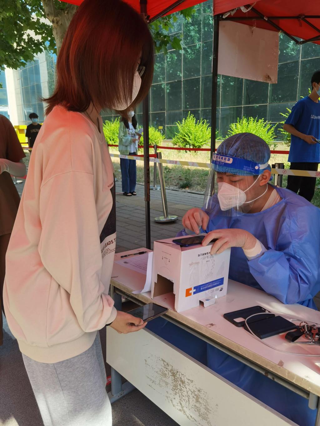 每天早上六点多,在艺体学部的核酸检测点,每日大约有60名青年突击队志愿者在现场提供服务,大家准时准点集合完毕,将椅子、扫码牌等物资放置到位,7:30分核酸检测开始时,他们就成了路口执勤人员、试管转运人员、维持秩序人员等,他们分工明确,井然有序。