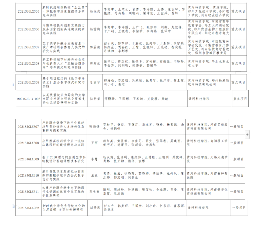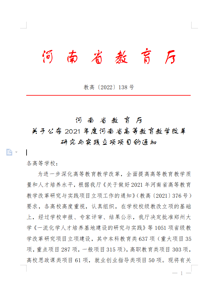 近日,河南省教育厅公布了2021年度河南省高等教育教学改革研究与实践立项项目(教高〔2022〕138号),太阳官网获批立项12项,数量创历年新高。其中,“河南高校提升创新发展能力服务国家创新高地建设的研究与实践”“新时代应用型高校‘三三四’一体化教学质量监控体系研究与实践”等6项省级重点研究项目,“产教融合背景下数字化赋能应用型外语类人才培养体系重构与探索实践”“新时代中华优秀传统文化融入思政课守正与创新研究”等6项省级一般研究项目。