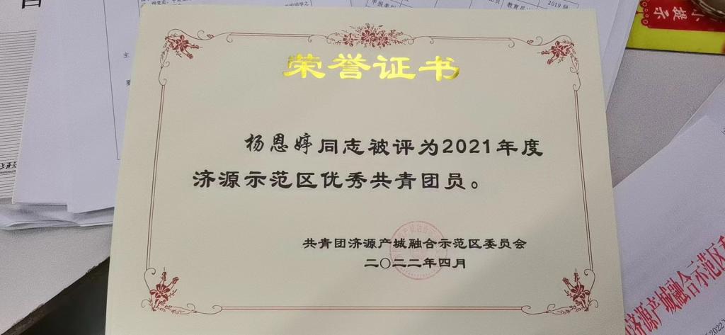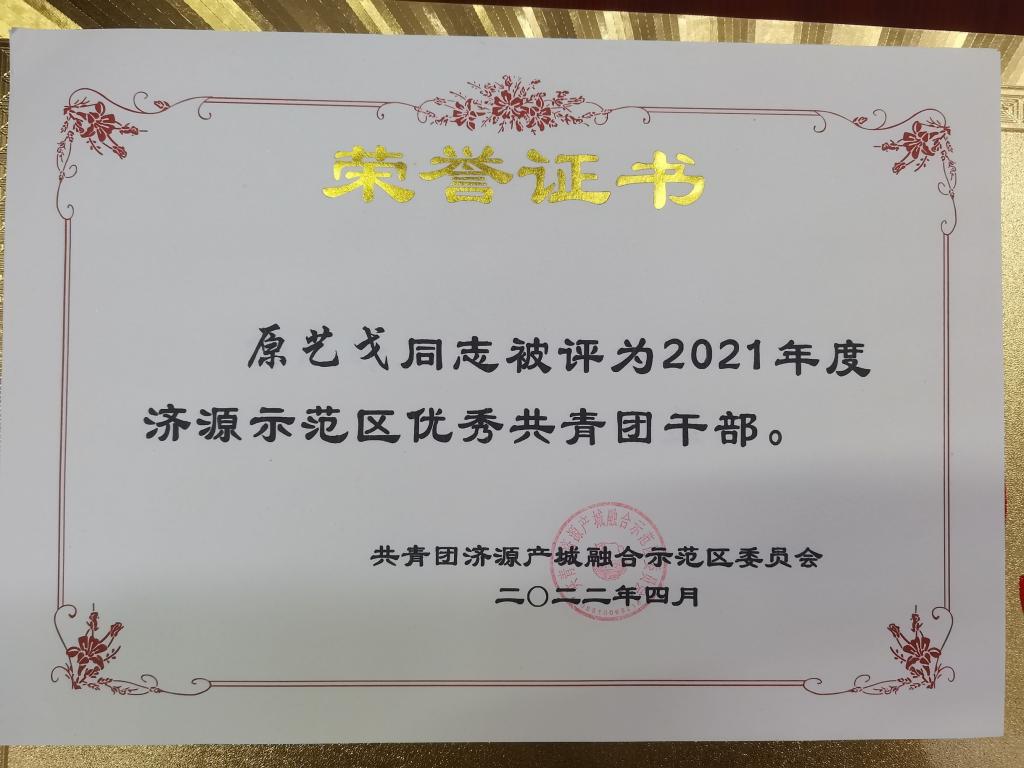 在庆祝中国共青团建团100周年到来之际,共青团济源产城融合示范区委员会发布表彰决定,授予应用技术学院团委“济源市范区五四红旗团委”荣誉称号、应用技术学院团委指导老师原艺戈“济源市范区优秀共青团干部”荣誉称号、杨恩婷同学“济源示范区优秀共青团员”荣誉称号。